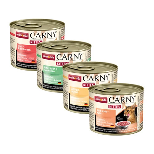 - Animonda Carny Kitten – Geflügelcocktail: 39 % Rind (Lungen, Herz, Fleisch, Nieren, Euter), 14 % Hühnchenleber, 6 % Putenherzen, 6 % Entenherzen und Calciumcarbonat.
