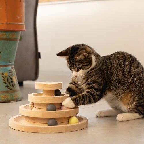 Designed by Lotte Spielturm Mia ist ein lustiges Katzenspielzeug aus Holz in Form eines Spielturms mit Bällen auf drei Etagen.