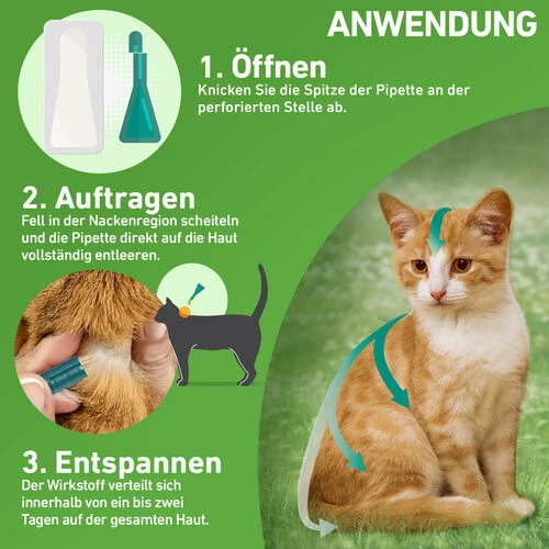 Eine Pipette von 0,5 ml pro Katze, für die lokale Anwendung auf der Haut. Minimales Behandlungsintervall: 4 Wochen.