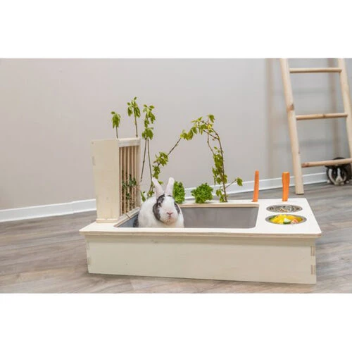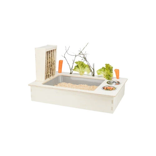 Mit dieser Futterstation von Trixie können Sie Ihrem Nager auf spielerische Art und Weise verschiedene Futtersorten anbieten. Ihr Haustier kann sich aussuchen, was es fressen möchte und wird nie zu kurz kommen. Die Station hat 2 Futter-/Wassertröge aus Edelstahl und eine Heuraufe. Es gibt zusätzliche Öffnungen für Zweige und Gemüse und eine herausnehmbare Toilettenschüssel aus Kunststoff. Die Futterstation besteht aus unbehandeltem Holz.