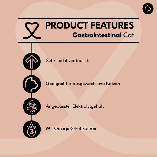 Bei Magen-Darm-Problemen kann die Ernährung eine wichtige Rolle spielen. Vetality Gastrointestinal wurde speziell von Tierärzten entwickelt, um Katzen mit Verdauungs- und/oder Magen-Darm-Problemen zu unterstützen. Dies kann zum Beispiel bei Beschwerden wie Verstopfung, Durchfall oder Erbrechen notwendig sein. Dieses Katzenfutter ist auch für Katzen mit empfindlichem Darm geeignet. Dieses Katzenfutter basiert auf Geflügel und ist leicht verdaulich. Es trägt zu einer gesunden Darmflora bei und unterstützt die Verdauung. Darüber hinaus enthält Vetality Gastrointestinal mehr Natrium und Kalium, um den Verlust dieser Stoffe durch dünnen Stuhl (Durchfall) auszugleichen. Das Futter enthält Omega-3-Fettsäuren, die zum Schutz und zur Erhaltung gesunder Zellen und Gewebe beitragen.